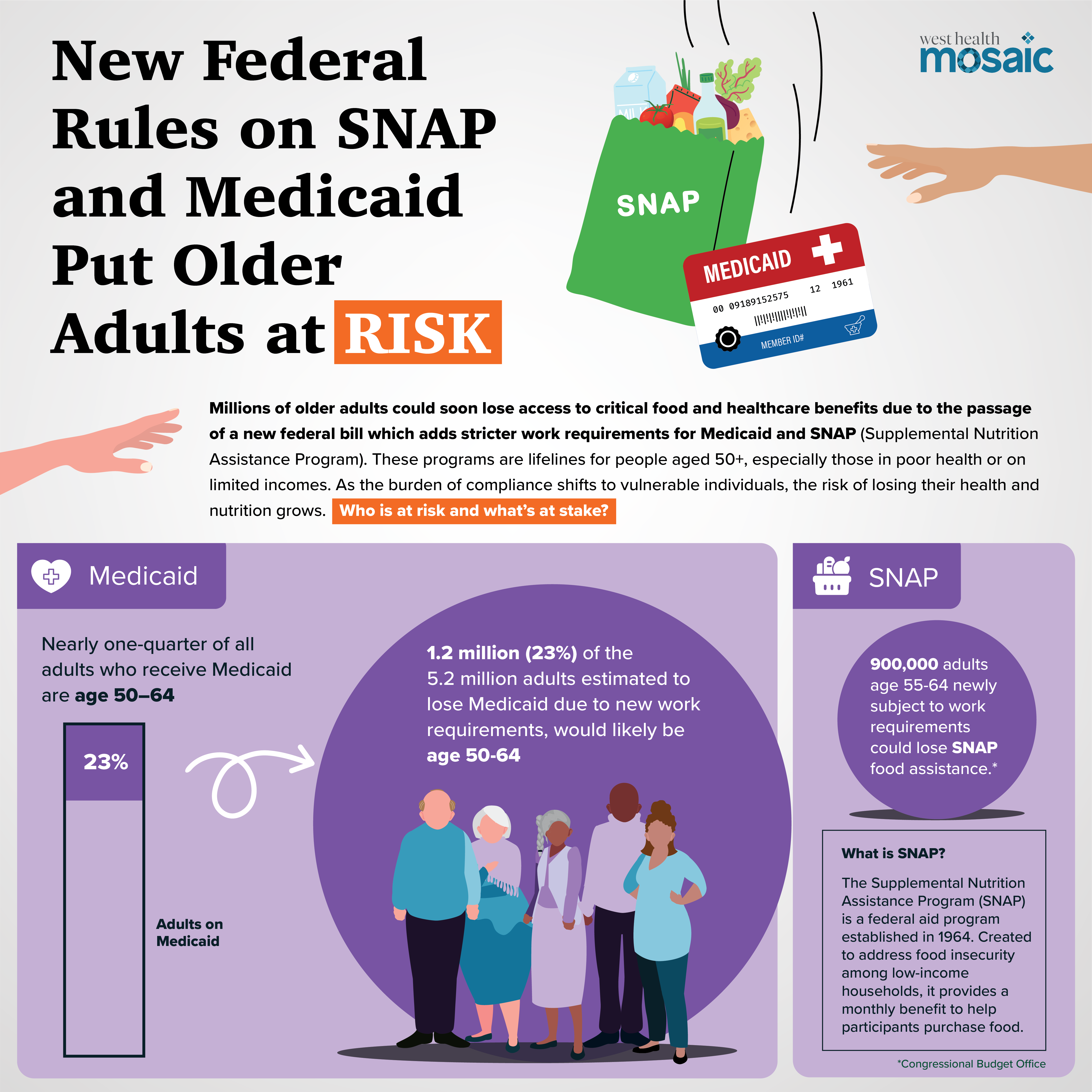December 10, 2025In the infographics below, we highlight who is most affected by the new federal rules, what’s at stake for older adults, and how changes to SNAP and Medicaid could deepen financial hardship and food insecurity for millions nationwide.